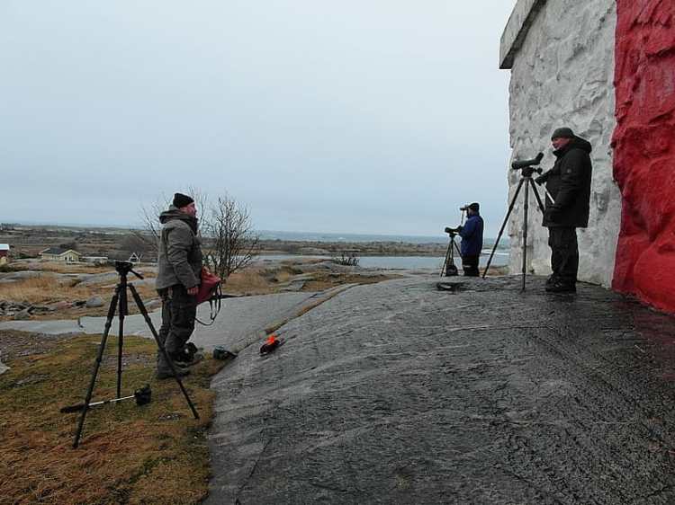 Lintumies lähti oppaaksemme saarelle ja lintuja katsomaan. Majakan seinusta on hyvin suojaisa ja mukava paikka lintujen tarkkailuun, ja siellähän niitä lintumiehiä olikin.
