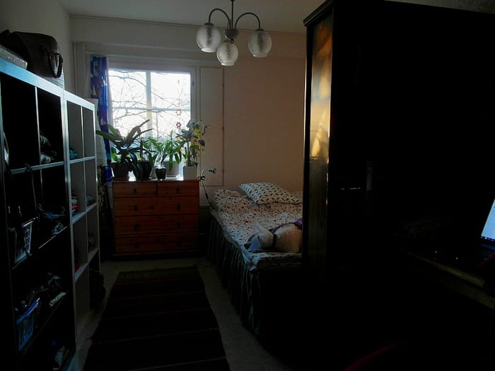 Tällaisessa huoneessa asun nyt sitten syyskuuhun saakka. Oma, vanha huoneeni. Ikean Expediteissa vasemmalla on vaatteet, mutta vaikka vaatteet pidänkin, niin noita hyllyjä en uuteen kotiin vie. Ne ovat niin täynnä naarmuja, että joutavat kaatopaikalle, kunhan ovat vielä palvelleet tässä viimeisessä etapissaan.