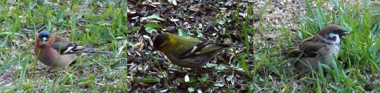 Kuvasin pihan pikkulintuja. Lintulauta on jo viety pois, mutta siemeniä on sen paikalla vielä miljardi.