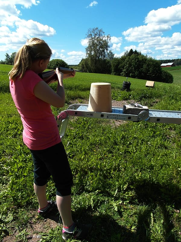 Olen kerran aikaisemmin elämässäni ampunut ilmakiväärillä. Tähtäsin silloin männyn runkoon, ja osuinkin. Tällä kertaa maalitauluina olivat tyhjät peltitölkit. Yhden hudin jälkeen osuin maaliin ihan hienosti monta kertaa. Homma on jopa lasten leikkiä silloin, kun saa nojata johonkin.