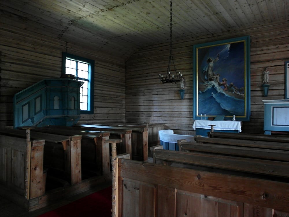 Kirkon sisällä värimaailma oli todella ihana. Komeat hirret loivat kaunista väriä ja tunnelmaa, ja siniset elementit olivat juuri täydellisen sävyisiä sopimaan yhteen hirsien lämpimän värin kanssa.