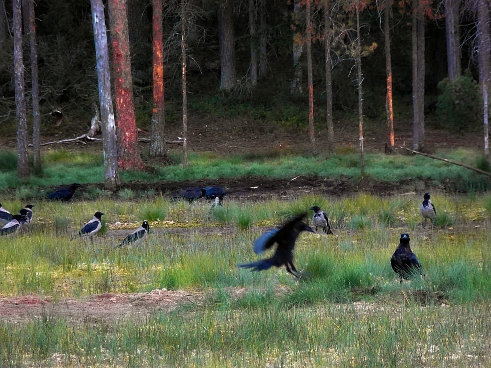 Viikonloppuna Kuhmossa meillä oli ilo seurata korppeja, variksia ja harakoita yhdessä.