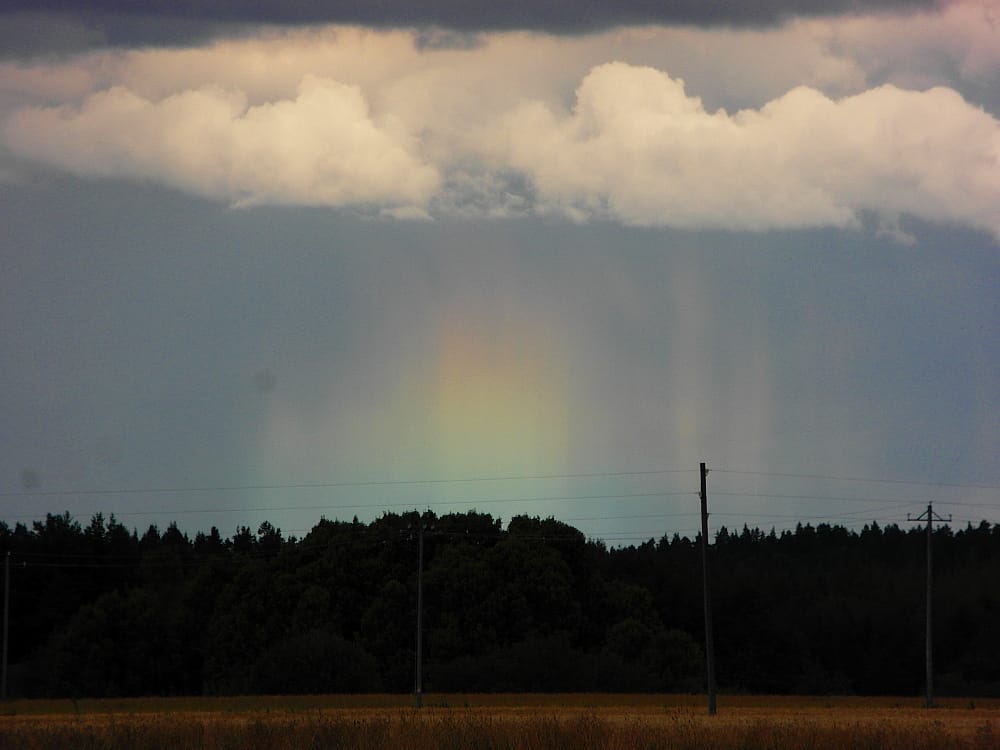 Paluumatkalla näimme erikoisen valoilmiön taivaalla. Se näytti kuin revontulelta, joka se ei tietenkään ollut, mutta malli oli hiukan samanlainen. Siinä oli sateenkaaren värejä ja se kohosi pilvisellä taivaalla metsän yläpuolella.