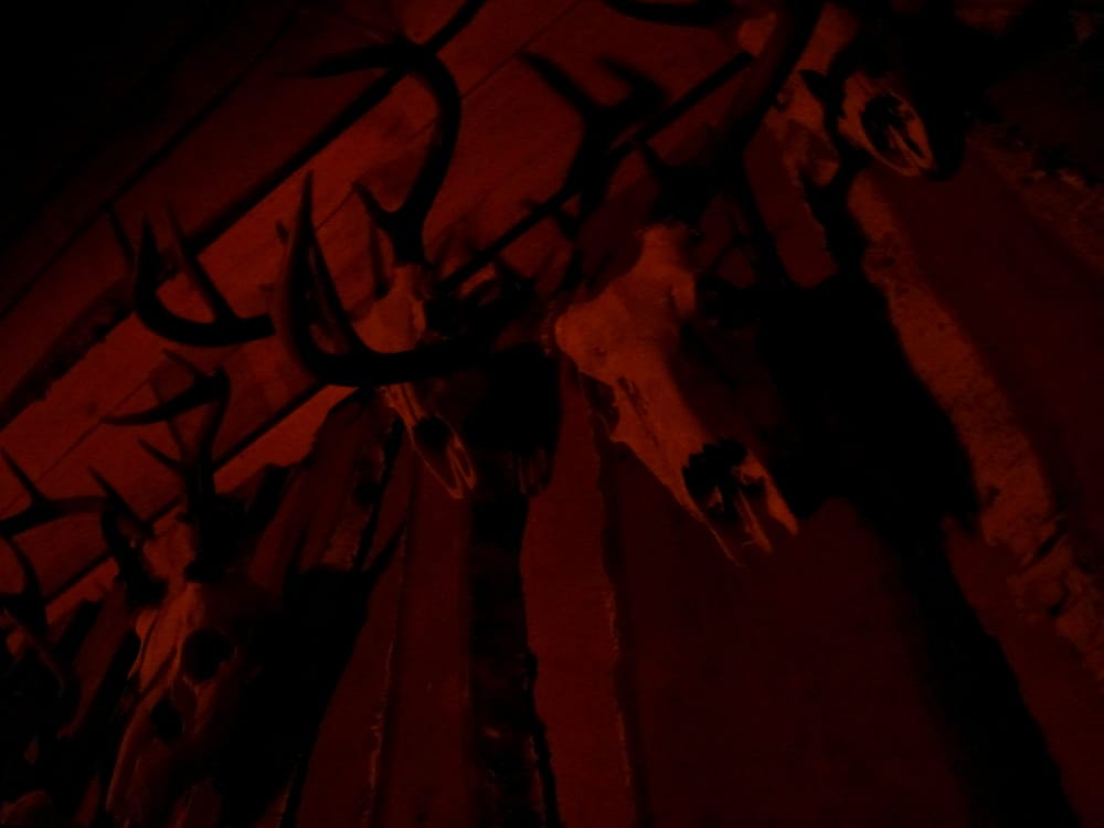 Yöhön kuului paljon herkkuja, myös grillaamista grillikodassa. Grillikodan seinällä oli pitkä rivi pääkalloja.