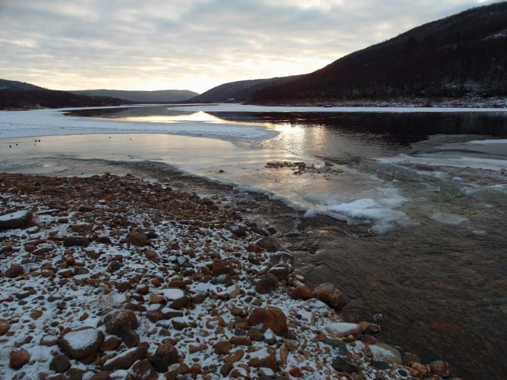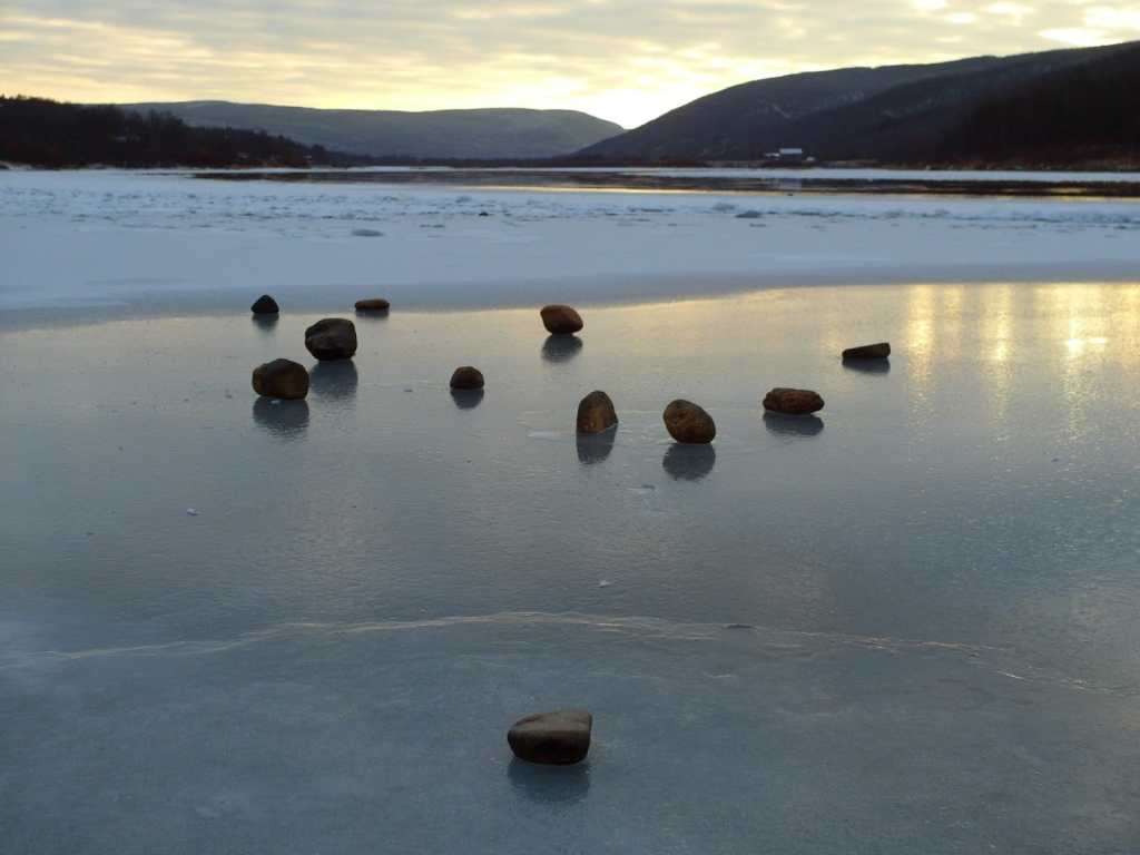 Pysähdyttiin rinteessä monta kertaa maisemia ihailemaan. Toivottiin, ettei karhu tulisi – se ei kuulemma olisi ollut ihan mahdotonta. Alhaalla kohisi koski, joka laskee Tenoon. Koski kohisi, koska se oli alkanut jo jäätyä. Myös Tenolla oli jo jäätä.