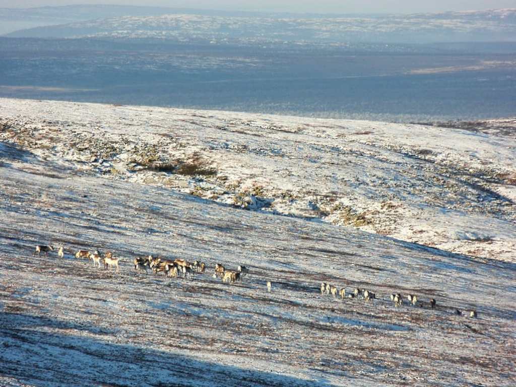 Matkalla näimme autosta valtavan porolauman tunturin rinteellä. Porot pakenivat meitä jo kaukaa.