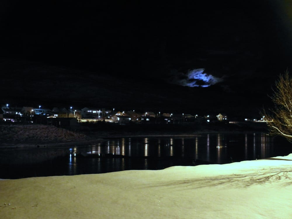 Pois ajaessamme pysähdyimme vielä suuren jääkarhupatsaan vierelle kuvaamaan kaupunkia etäämmältä. Kuvassa vasemmalla näkyvä kirkas alue on saari, jolla on öljynjalostamo. Sen kirkkaimmat, korkeimmat valot ovat tornien huipulla kohoavia, valtavia liekkejä.