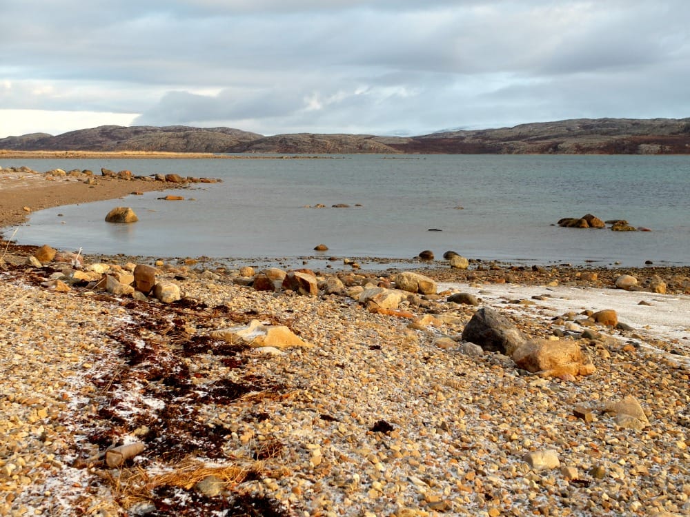 Nyt käytiin rannassa kävelemässä ja syötiin vähän eväitä. Jäämeri oli turkoosi ja tuuli kylmä, mutta ei mahdottoman kova. Lunta oli maassa ohuen ohut harso, johon tuuli oli tehnyt omia muodostelmiaan.