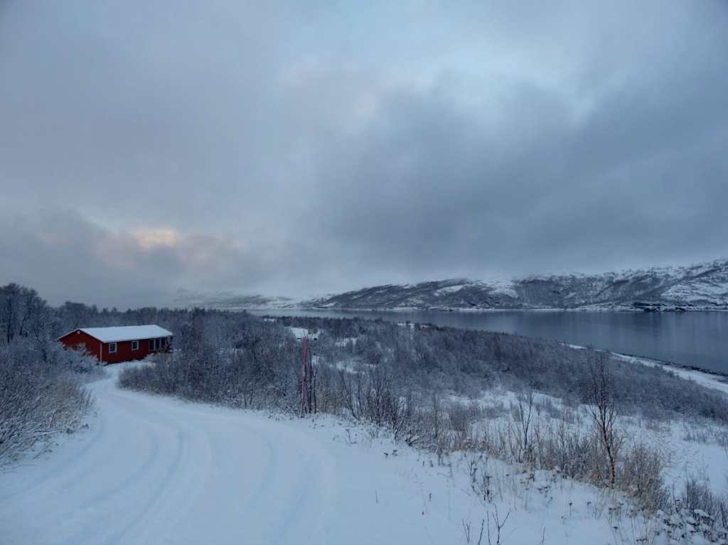 Täältä on Hammerfestiin noin kolmen ja puolen tunnin ajo. Aamulla aurinko paistoi ja pakkasta oli 13 astetta (tänään -24).
