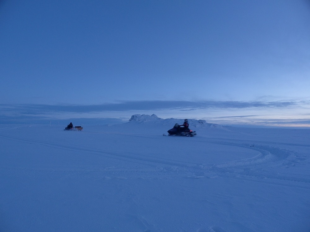 Meillä oli mukana kaksi samojedia, joten kelkkakuskeina toimineet pojat näkivät parhaaksi ottaa reen mukaan. Ensimmäinen kuski ajoi yksin edellä tasoittaen meille tietä. Toinen kuski tuli perässä ja veti meitä reessä.