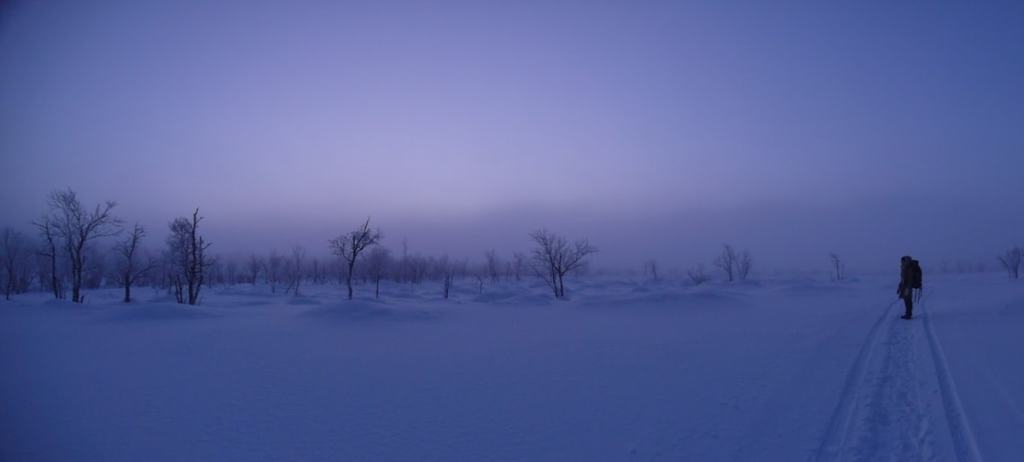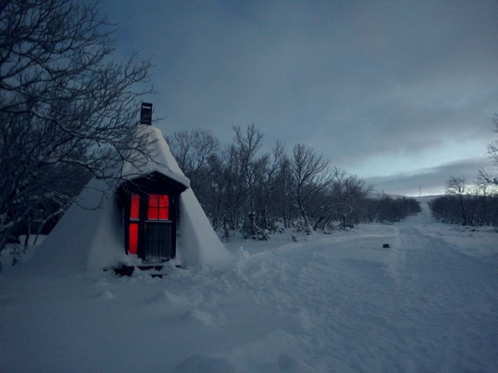 Olin viime yön ystävän kanssa tunturissa, Ailiggaan kammissa. Lähdimme kävelemään kohti kammia seitsemän aikoihin illalla, töiden jälkeen. Molemmilla oli isot reput selässä. Mukana oli makuupussit, trangia ja eväitä sekä tietenkin lämpimiä vaatteita. Mukana olivat myös ystävän kaksi koiraa.