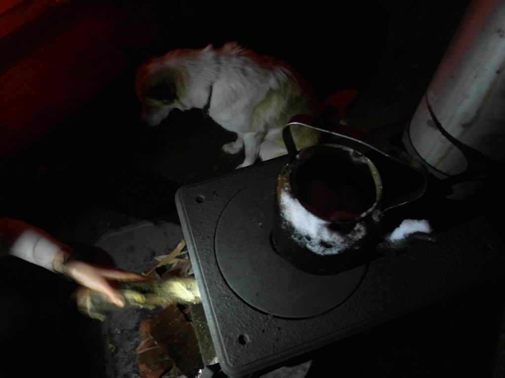 Ystävä keitti trangiassa puuroa ja minä hain nokipannuun lunta, josta keitimme teetä. Pakkasimme tavarat ja siivosimme kammin ennen lähtöä. Hain vielä lopuksi vajasta uuden sylillisen puita seuraavalle matkaajalle. Jätimme kammiin myös muutaman kynttilän.