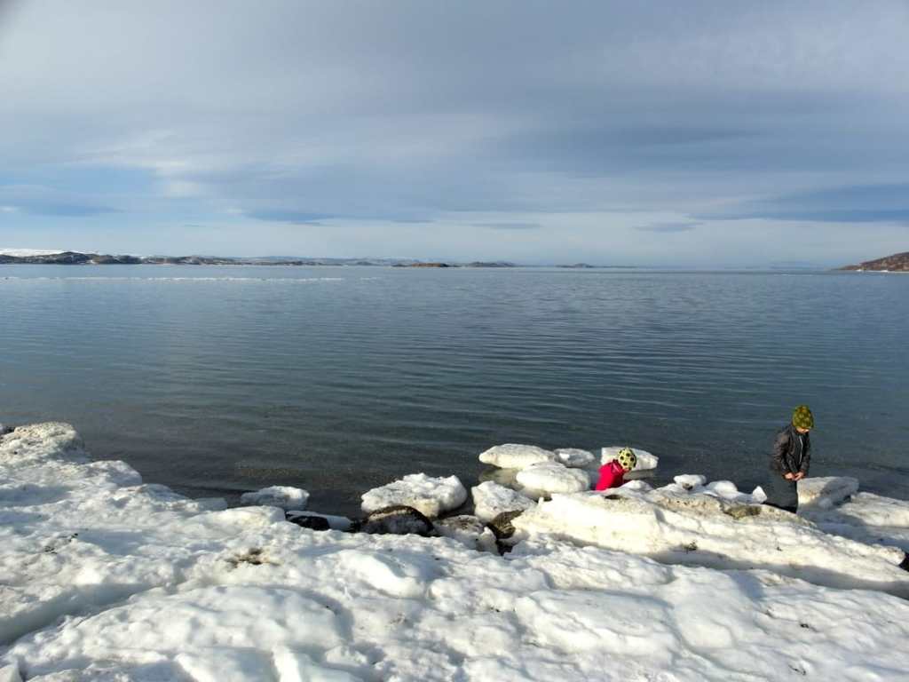 Ensimmäisenä päivänä ajoimme Jäämeren rantaan Lakselviin. Meri oli sulanut paljon viikontakaisesta. Lapset ja aikuiset löysivät rannasta monennäköistä kiinnostavaa, esimerkiksi paljon kiviä. Näimme myös halleja pulikoivan merellä.