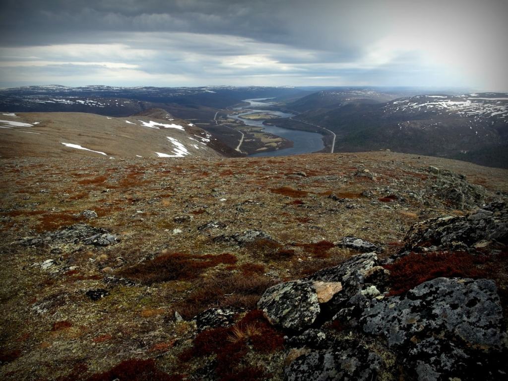 Fiilistelimme tunturin huipulla hetken aikaa. Katselimme kauniita kiviä ja ihailimme ihanaa maisemaa alas Tenolle. Norjan puolella huiput olivat vielä aika tukevasti lumessa.