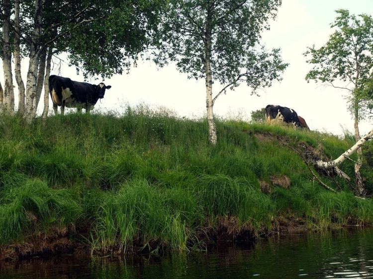 Naapurin lehmät ihmettelivät meitä kun saavuimme kanootilla kotiin.