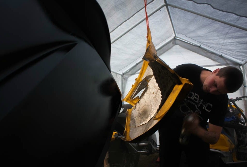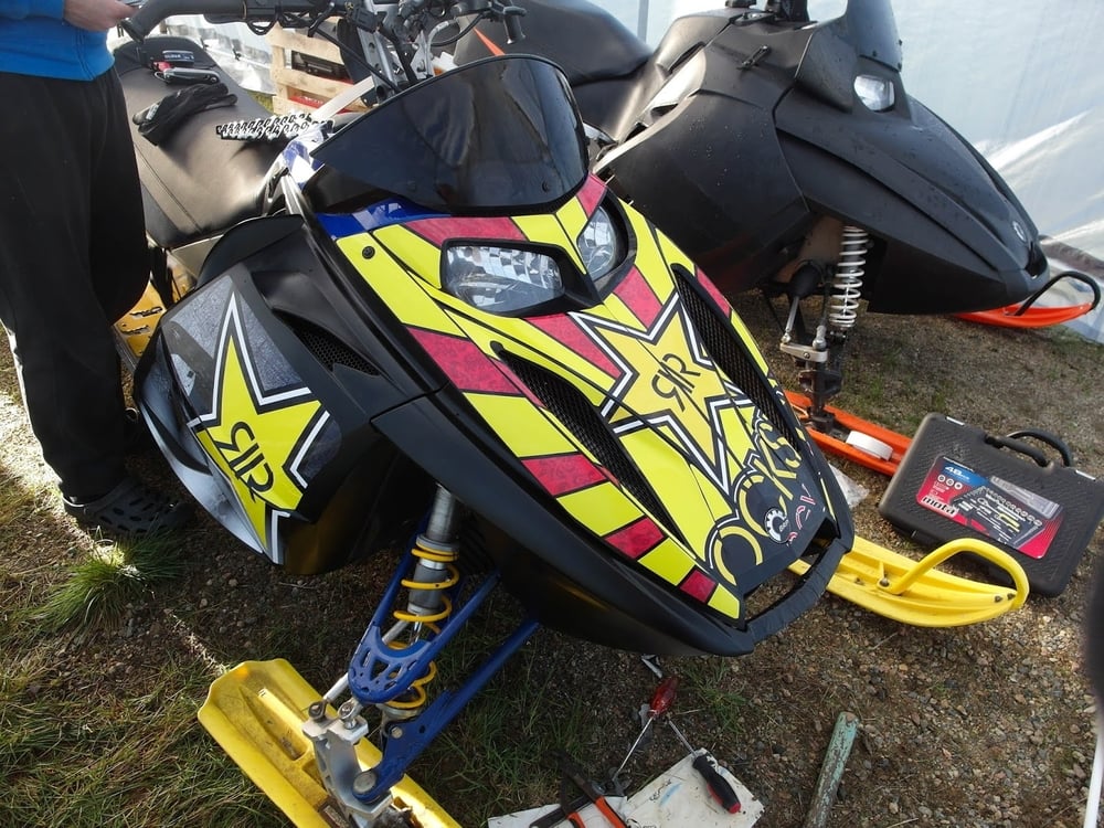Mies irrotti teipattavat osat ja maalasi ne mustiksi sellaisilla maaleilla, joiden kuulemma pitäisi muovipinnallakin kelkan lumihangessa rymyämistä kestää. Tietenkin ensin pesu vahvoilla myrkyillä, sitten pohjamaali alle ja lopulta kaksi kerrosta kiiltävää mustaa ja vielä kirkaslakka päälle. Myös tuulilasilätkä sai maalikerroksen.