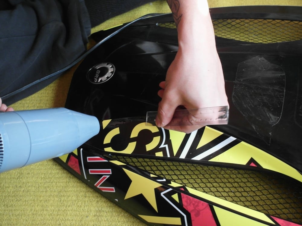 Suurin ongelma oli kuitenkin kokemattomuutemme. Föönillä tarroja sai lämmitettyä vetelämmiksi siten, että välillä siitä oli apua, välillä haittaa. Vetelä tarra oli mahdollista venyttää ja ohjata haluttuun paikkaan. Toisaalta sitä saattoi venyttää myös tahtomattaan, liikaa tai väärästä kohtaa.