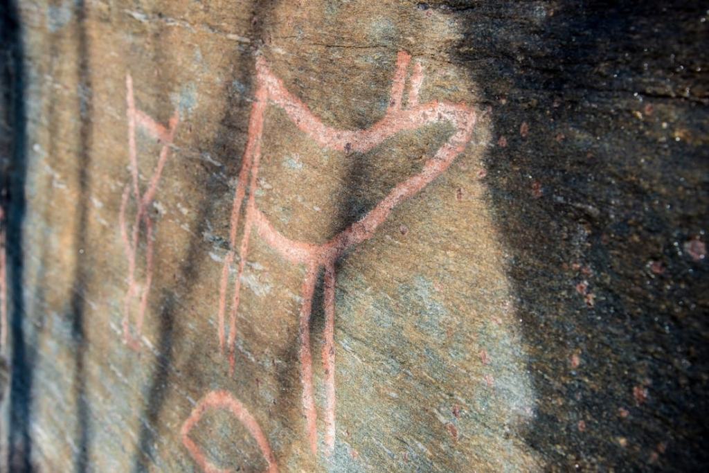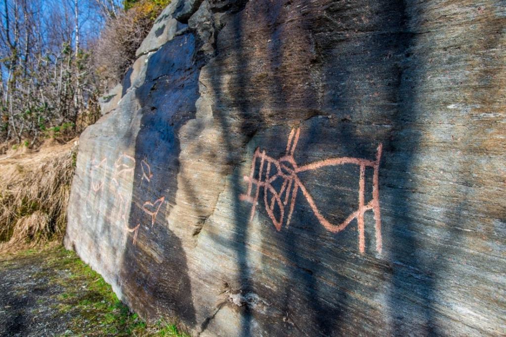 Upealla paikalla tien vieressä, vuoren ja meren välissä, oli kalliokaiverruksia. Niitä on maalattu jotta ne olisi helpompi erottaa. Niitä on siellä enemmänkin kuin mitä nyt näimme, mutta loput ovat yksityisellä maalla aidan takana.