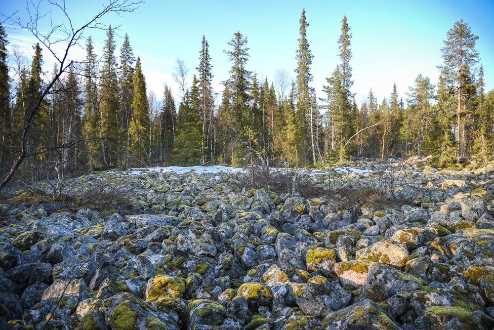 Poikkesin metsäpolulta ja lähdin ilman muuta tutkimaan tuota kivipeltoa. Se ei ollutkaan ihan helppoa. Olen monenlaisia rakkoja ylittänyt, mutta tämä tuntui erityisen hankalalta. Ihan kuin jokainen kivi olisi valinnut suunnata terävimmän reunansa taivasta kohti. Osa kivistä kiikkui. Jokaisen askeleensa sai todella harkita.