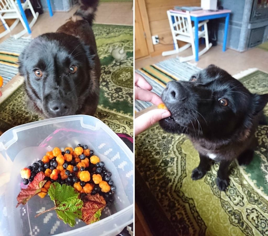 Jaoimme muovikippojen sisällöt kuksiin ja lusikoimme marjat suuhumme sohvalla. Ai ettäkö oli hyvää! Moskulle tosin riitti vain yksi hilla, hänestä ei tullut suurta fania.