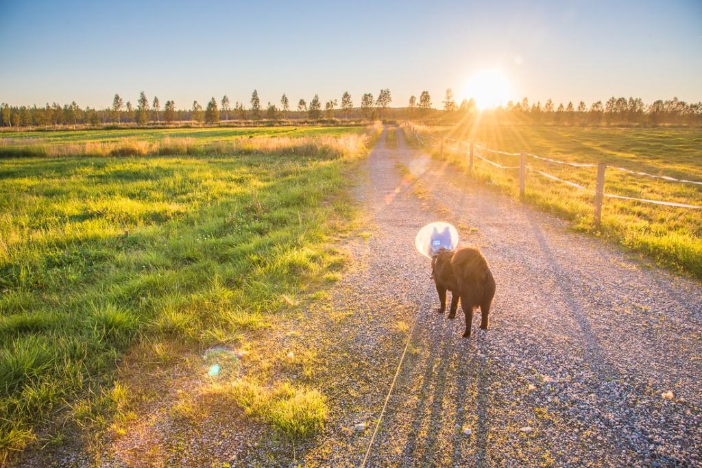 Mosku leikattiin juuri ja nyt mennään ämpäri päässä hetken aikaa. Kova on kolina kämpässä. Muutaman päivän ajan olemme ulkoilleet vain kotipihalla ja lähinurkissa. Loppuviikolla uskaltaa kuulemma taas aloittaa jo kunnon lenkit.