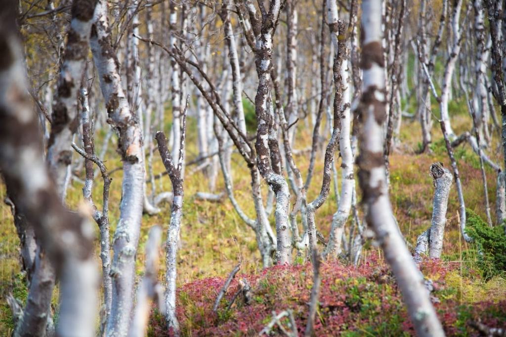 Alempana koivut ovat valkoisia, ylempänä niiden rungot muuttuvat vienosti punertavan hopeisiksi.