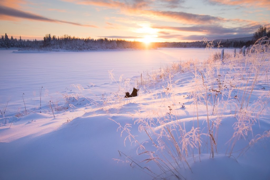 Jätimme tänään hyvästit auringolle ottamalla lumikylvyt pihalla. Aurinko vilkahti esiin enää vain pieneksi aikaa, mutta juuri sopivasti, että saimme nauttia pöllyävän lumihangen kimalluksesta samalla kun pyörimme lumessa.