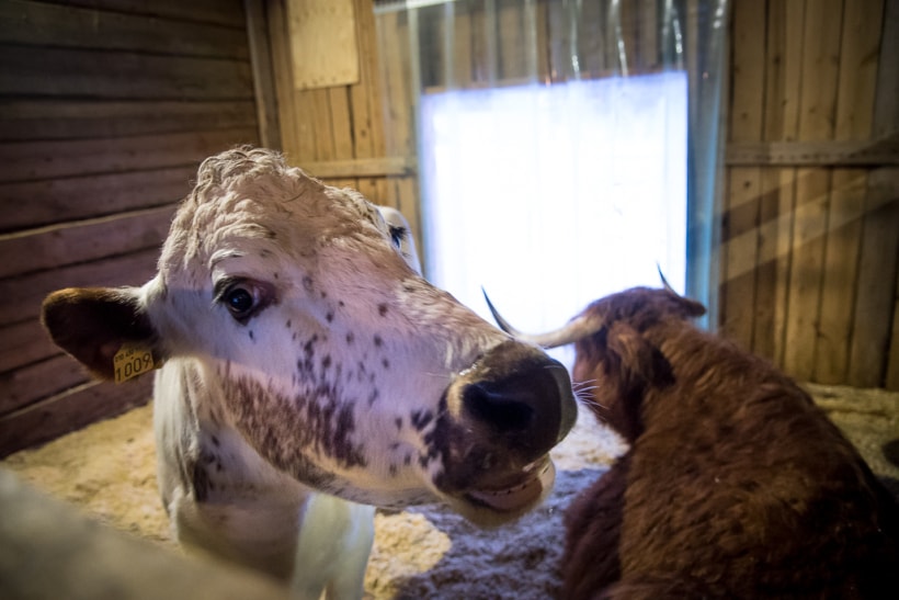 Lapinlehmä Hertan olemme nähneet monta kertaa ajaessamme kotieläinpihan ohi. Viime aikoina huomiota on herättänyt myös Hertan uusi kaveri Einari, joka edustaa ylämaankarjaa.