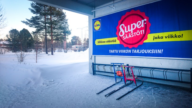 Takastullessa haimme Lidlistä tikkarit. Kaksi potkukelkkaa oli pysäköity nätisti pyöräparkkiin, mutta kolmas, harmaa, oli kurvattu suoraan pääoven eteen. Se oli jonkun anarkistin kelkka varmaankin.