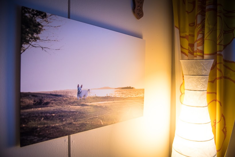 Keltaisen lipaston yläpuolella kunniapaikalla on vanhan koirani Hennin kuva, jonka olen saanut parhaalta ystävältäni.