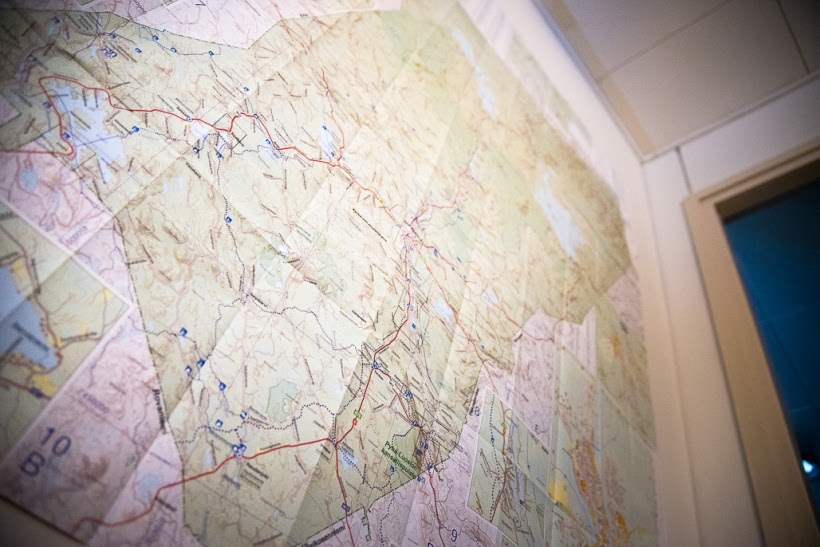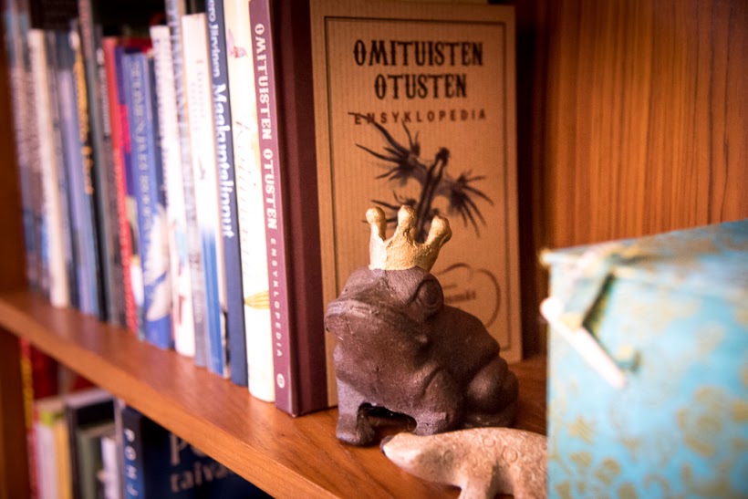 Rautainen sammakkoprinssi ja äidin antama kivilisko vartioivat kirjahyllyä. Seinällä on valtava Sodankylän kartta, jonka sain kunnanvirastosta.