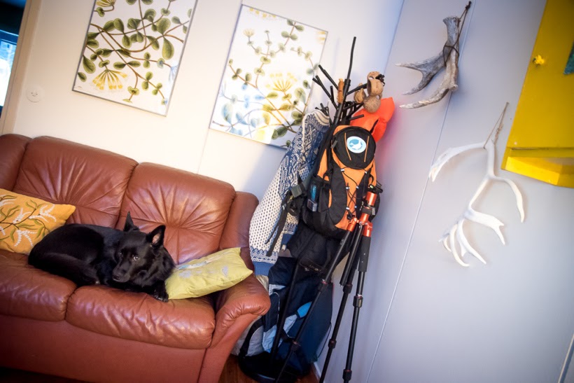 Nurkassa oleva naulakko on hautautunut retkikamojen alle. Siinä roikkuvat kuksat, puukot, makuupussit, reput ja kameralaukut. Kameran jalusta on valmiina revontulikuvauksia varten.