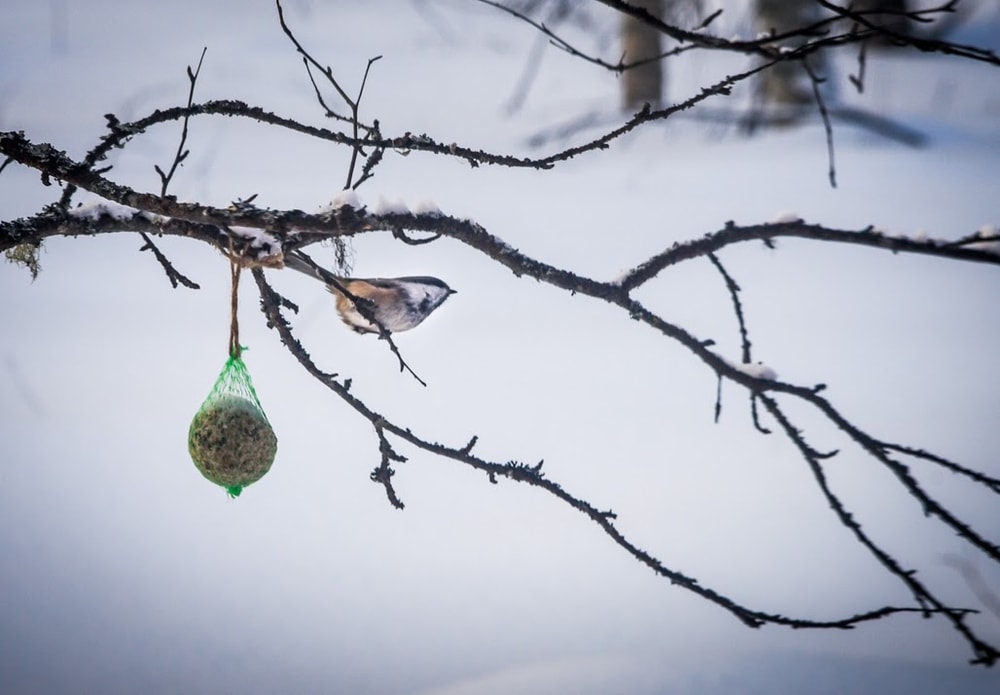 Eilen kävin korjaamassa rasvapötkylän asettelua siten, että linnut pääsevät sitä paremmin nokkimaan. Liukkaasta rasvapinnasta kun eivät lintujenkaan pienet varpaat saa sellaista otetta, että ne voisivat siinä roikkua ja samalla syödä.