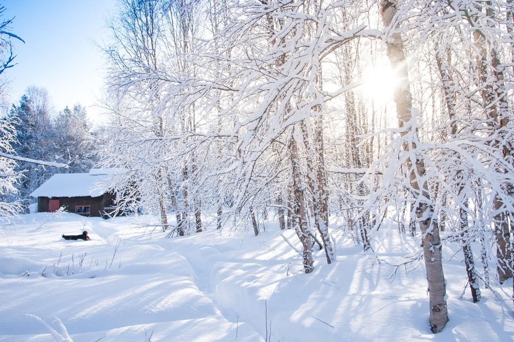 Tallottiin Moskun kanssa metsään puolen kilometrin lumikenkäreitti. Ei ollut ihan helppo ensimmäinen kierros, lumikengät upposivat noin puoleen väliin hankea, mutta sittenkin lumi nousi polveen saakka.