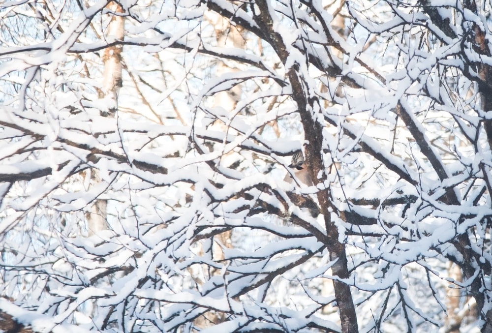 Närhi tarkkaili meitä puiden lomasta. Löydätkö sen kuvasta?