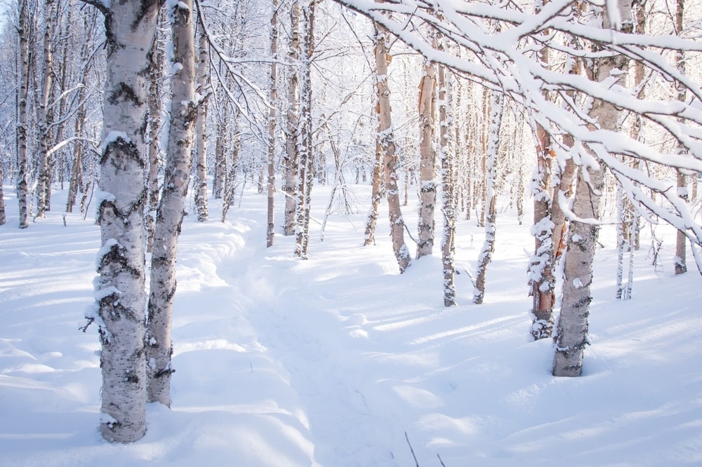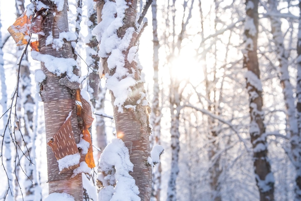 Koivujen repaleiset, paperimaiset tuohet näyttivät kaikki kauniit värinsä aamuaurinkoa vasten.