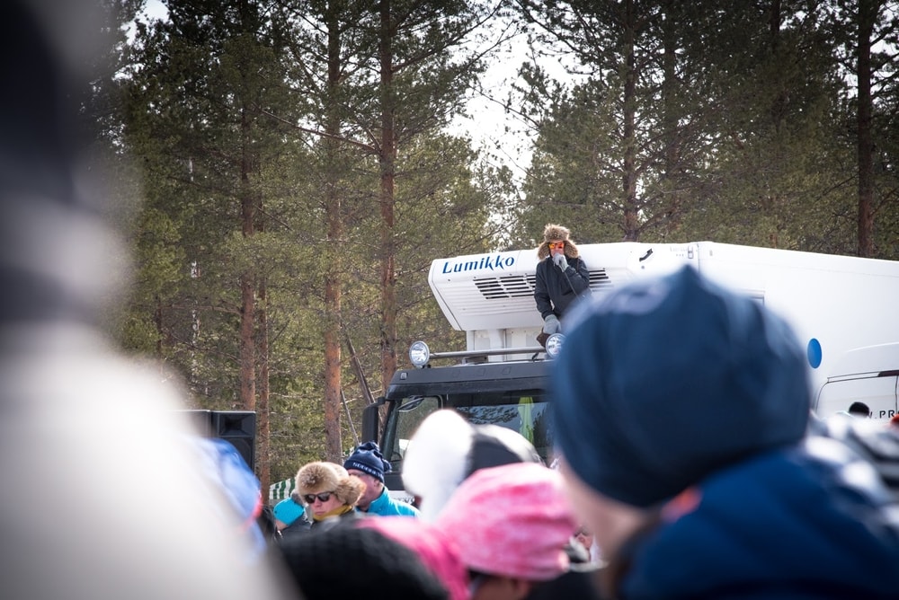 Tallustelin muun joukon mukana kisa-alueelle, jossa kisat olivat hetki sitten jo alkaneet. Ilmeisesti joku kisaporo oli alkanut oikutella, sillä meidän piti odottaa veräjän takana, että moottorikelkkailija sai poron ajettua pois radalta. Kun tilanne oli ohi, veräjä avattiin, ja pääsimme kulkemaan varsinaiselle tapahtuma-alueelle.