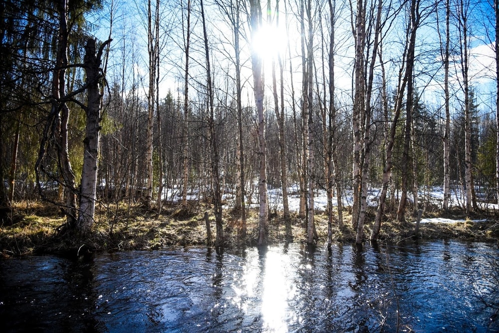 Suurimmat lumet ovat nyt sulaneet. Joki on korkealla, mutta toiveidemme mukaisesti se ei ole ulottanut vesiään paikalle, johon olemme suunnitelleet pystyttävämme laavumme.