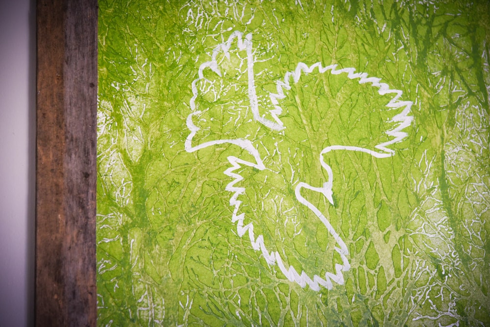 En muista, olenko koskaan töpötellyt maalia rypistetyllä muovipussilla, mutta nytpä tuli sellaistakin tehtyä. Efekti oli juuri toivomani, sillä erilaisilla hinkkaus- ja töpöttelytaktiikoilla sain tapetin metsäkuvioon luotua juuri sellaista keväisen valon ja vehreyden tuntua, kuin olin tavoitellutkin.