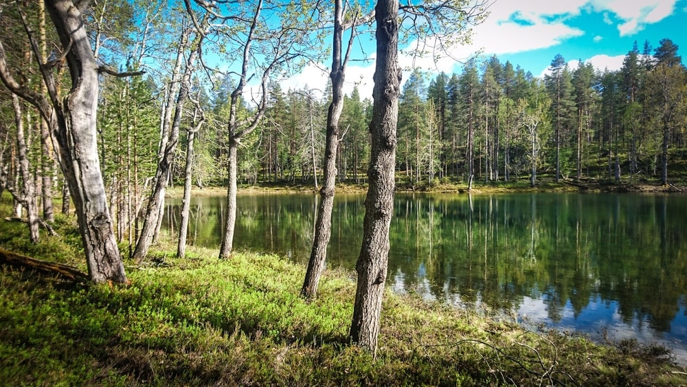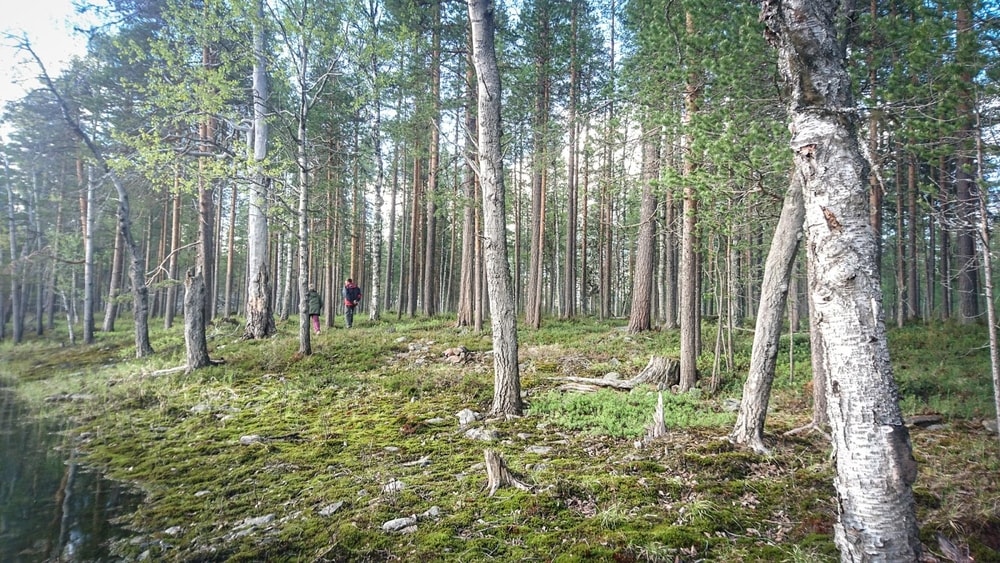 Aluksi on valoisaa kelometsää, sitten maasto muuttuu rakkarannaksi ja kohoaa melkein vuoreksi. Sitten on jälleen metsää, hieman tiheämpää kuin aluksi, ja rannalla kasvaa jättimäisiä haapoja.