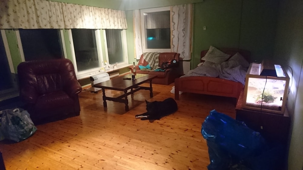 Oli täällä jotain hyviäkin mööpeleitä, kuten sänky, nojatuoli ja keltainen hyllykkö (alla kuvassa). Meillä oli kuitenkin pääasiassa omat, kivat huonekalut ja tekstiilit vanhastaan, niistä suurin osa on peräisin kirpputoreilta Salosta. Uutena olemme ostaneet vain sohvan ja sohvapöydän sekä minulle työpöydän.