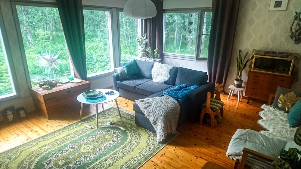 Olen halunnut yhdistää taloa ympäröivän metsän tunnelmat, värimaailmat ja elementit myös sisälle taloon. Puu on vahvana teemana: puulattian lisäksi talossa on paljon puisia huonekaluja, metsätapettia ja erilaisia puiden oksia sekä tietenkin kaikenlaisia metsästä löytyneitä aarteita.