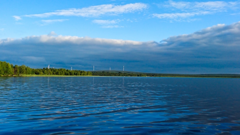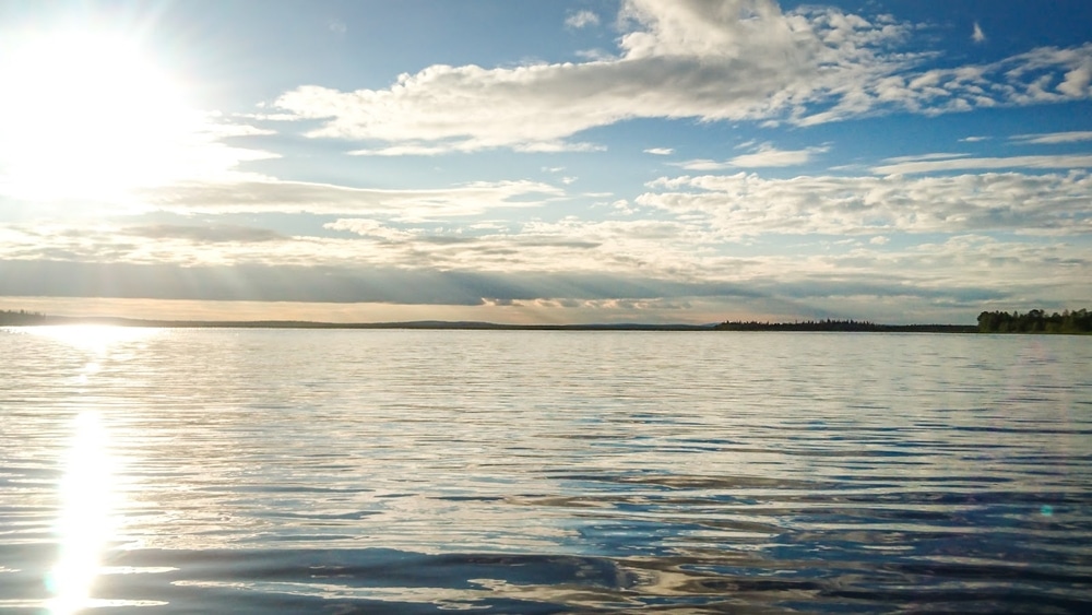 Vesi oli todella lämmintä. Vaalajärvi on matala, se lämpenee nopeasti kunhan vain muutamakin lämmin päivä viivyttelee Sodankylän yllä. Viime päivinä on ollut vähän sateitakin, ja etelän suunnalla näkyikin sadepilvien matto väistymässä poispäin. Tummia pilviä vasten Joukhaisselän tuulimyllyt hohtivat valkoisina.