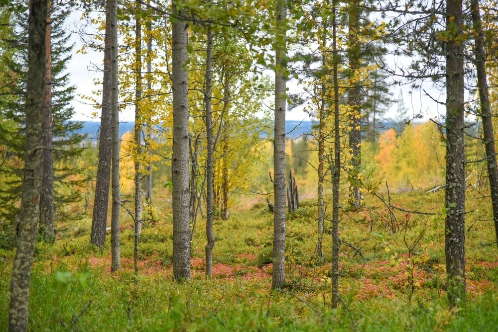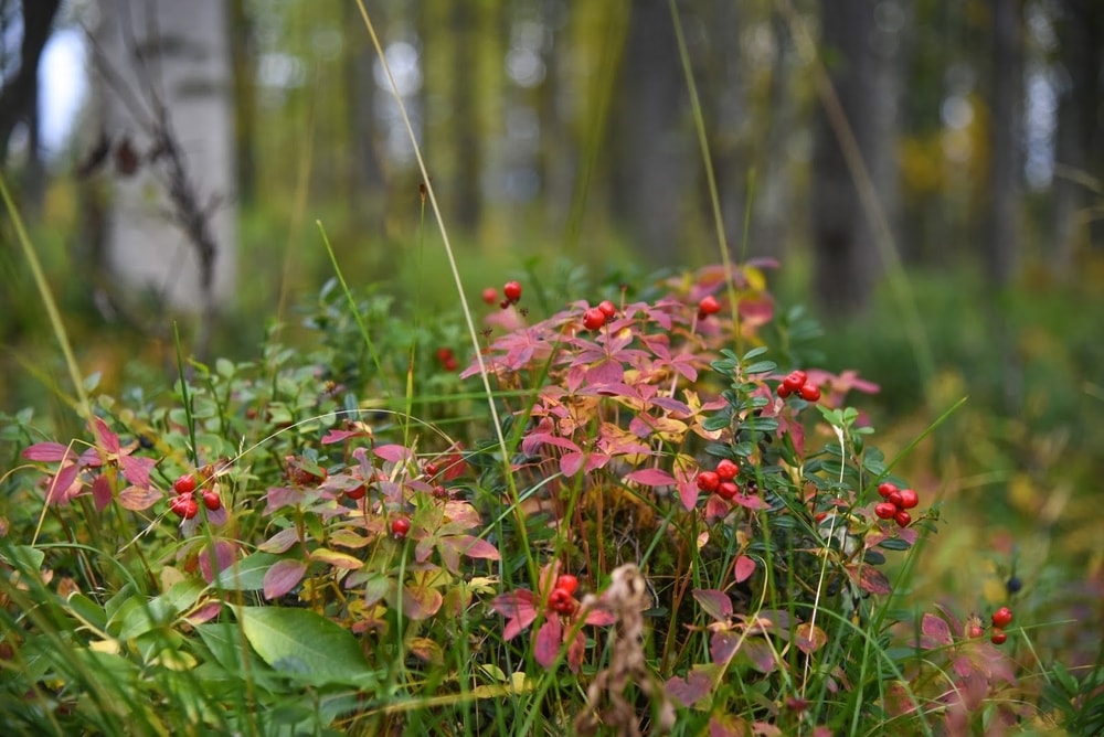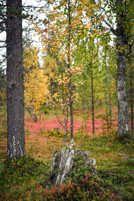 Juolukoiden ruska oli upeimmillaan. Koivuista iso osa oli kirkuvankeltaisia, mutta moni haapa oli edelleen kesäasussaan. Metsässä ja hakkuuaukeilla koitin tiirailla poronsarvia, mutta sellaisia aarteita ei löytynyt tällä kertaa.