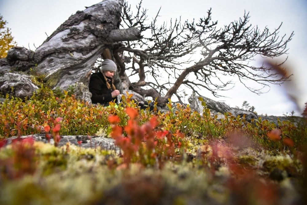 Erikoinen kelo kiinnitti huomioni, ja astelin rakan yli sen luo. Puun paksu runko oli kiertynyt tuhannelle kierteelle ja kaartunut vieläpä holviksi niin, että osa männyn latvuksista kosketti rakkaa. Käperryin kelokaaren alle evästauolle. Puu antoi suojaa tuulelta, siinä oli hyvä olla.