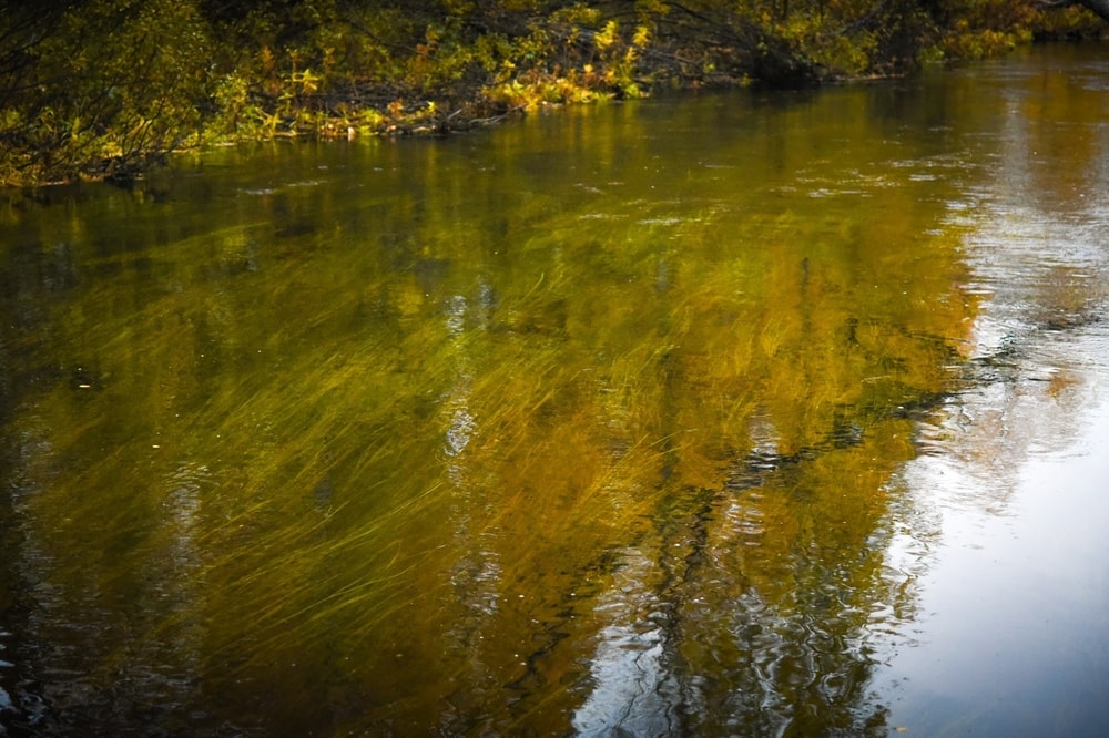 Pinnan alla vesikasvit hulmuavat virran mukana.