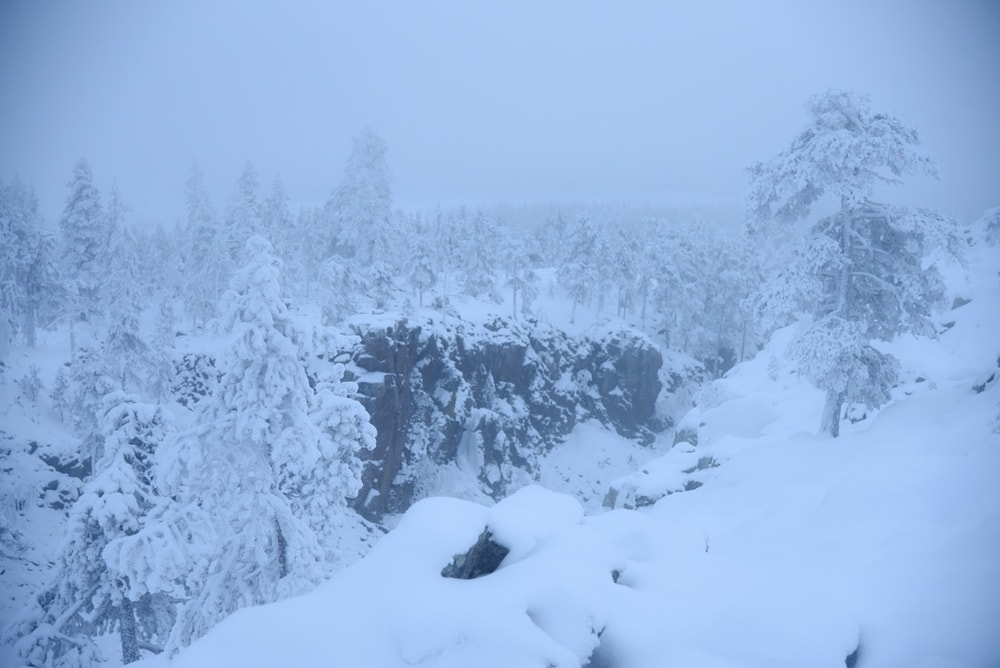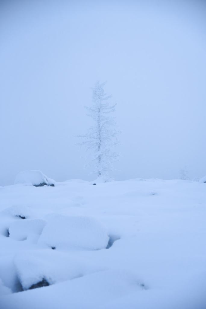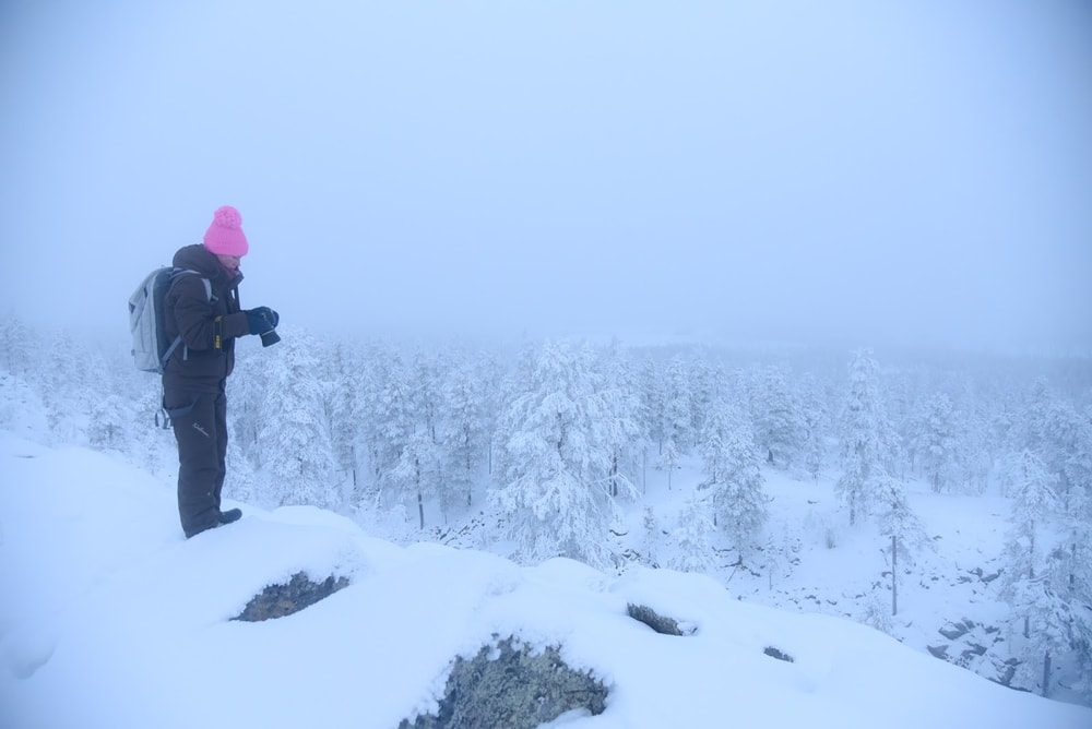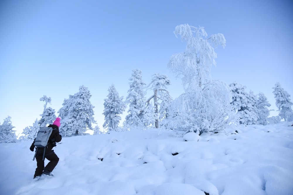 Säätiedotuksen perusteella olin odottanut pilvistä viikonloppua. Kuitenkin kun mieheni nakkasi meidät autolla reitin lähtöpisteeseen, saimme ihailla kirkasta taivasta. Taivalsimme metsään ja aloimme hiljalleen nousta lumiseen vaaran rinteeseen – metsän kauneutta ihaillessa nousu tuntui kevyeltä ja aika pysähtyneeltä.