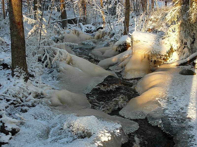 Kaipaan sitä näkyä, kun metsäpuro ei ole hävinnyt taistelua talven ja pakkasen kanssa, vaan jään ja lumen keskelläkin vesi virtaa kohisten ja vuolaana. Tätä näkyä ja ääntä minulla on todella kova ikävä. Kun Lapin talvi jäädyttää kaiken ikuisuudelta tuntuvaksi ajaksi, tuntuu, kuin osa minustakin jähmettyisi talviuneen, kuin omakin energia pysähtyisi veden mukana.
