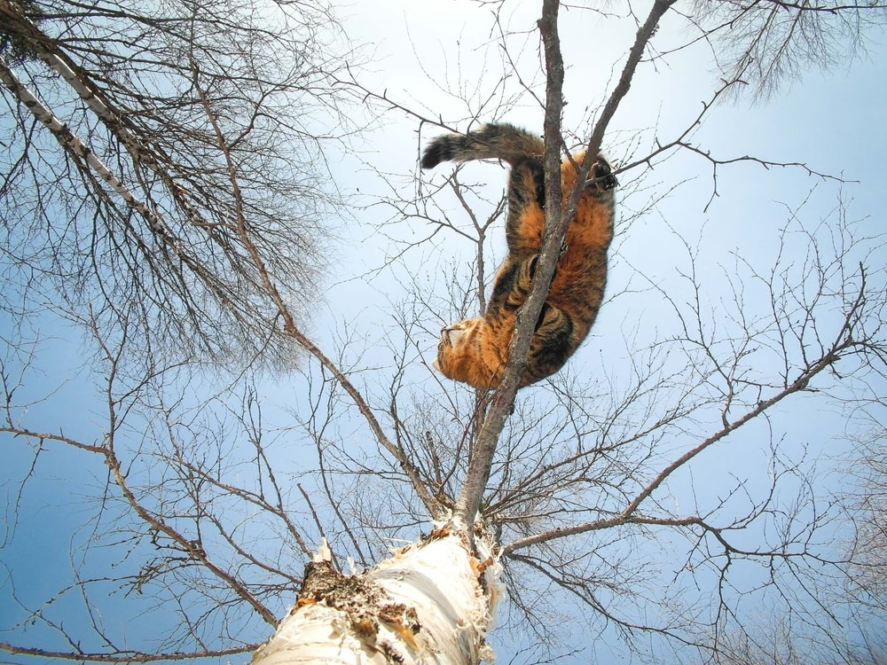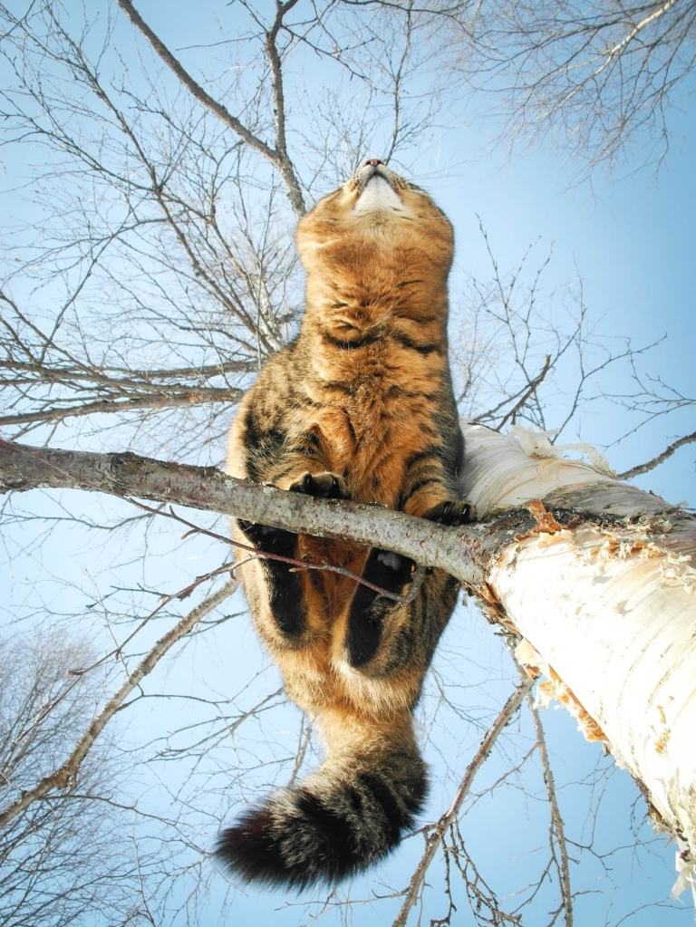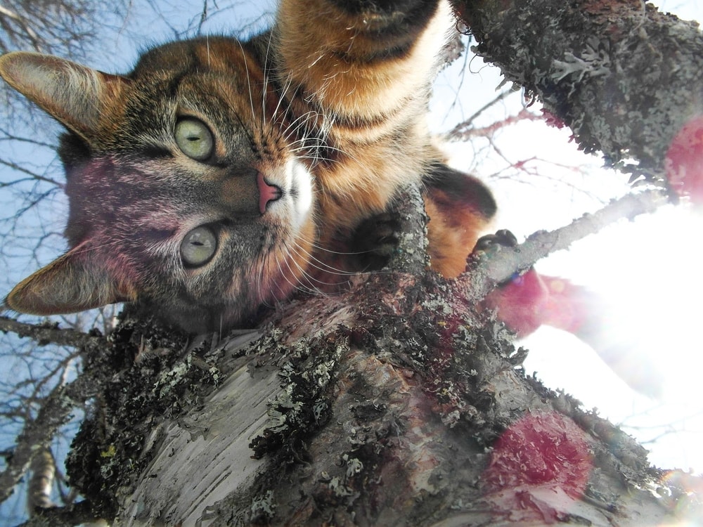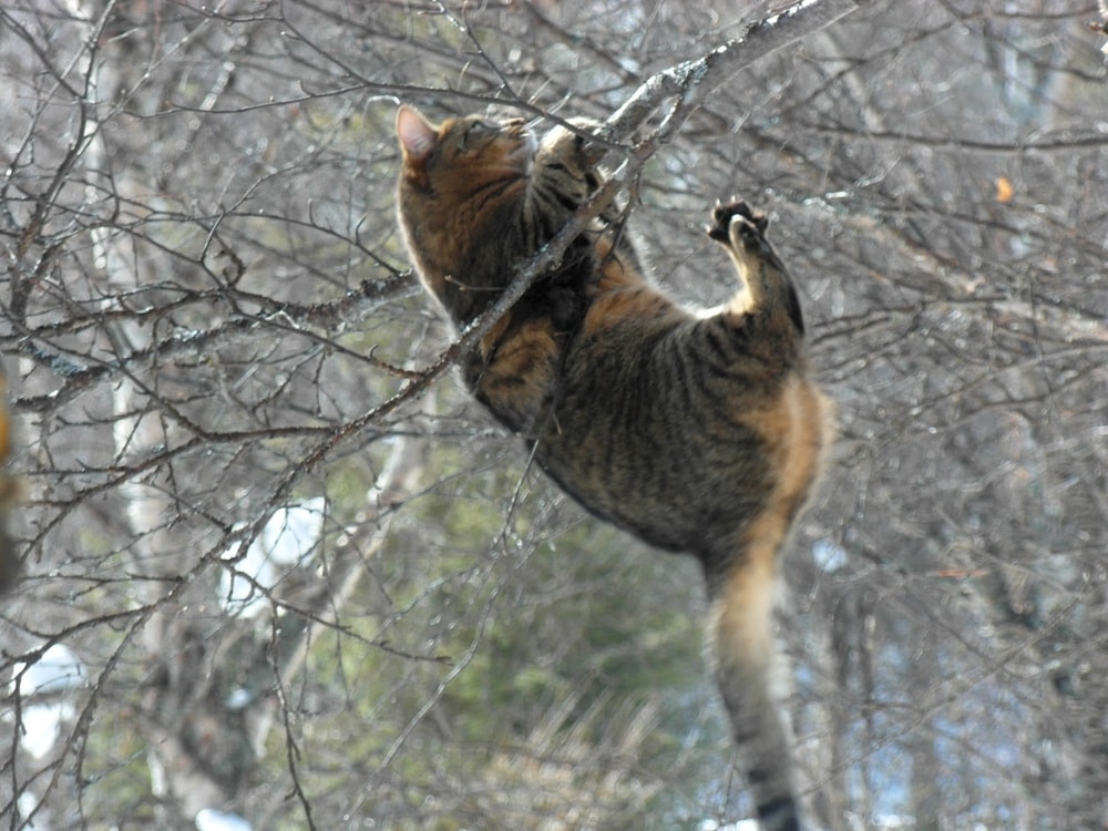 Kun olen sopivan lähellä, kissa syöksyy puuhun kuin nuoli.