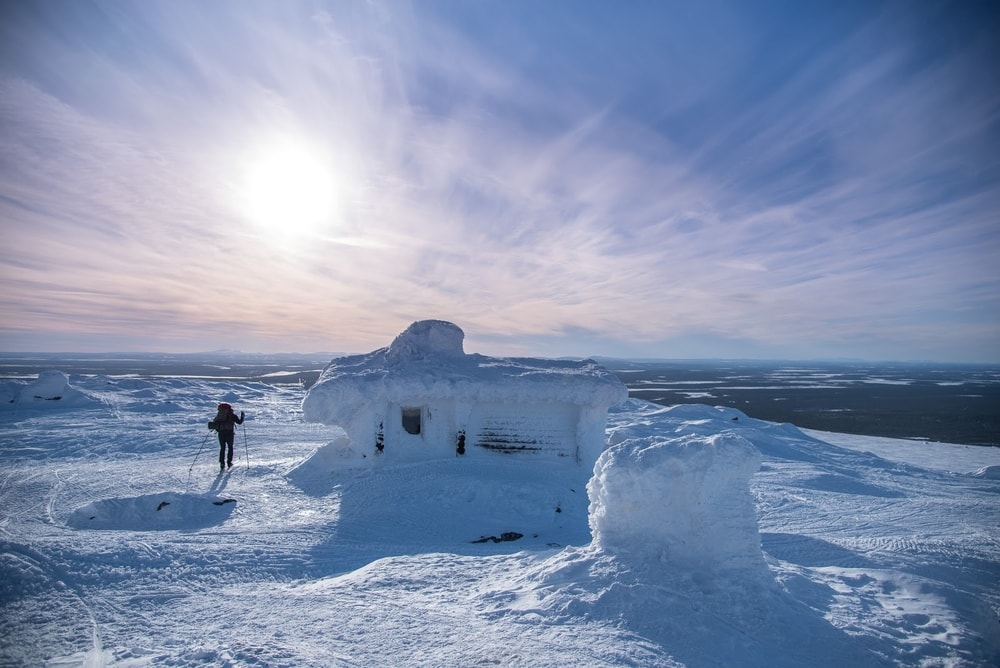 Yksi hiihtäjä sattui huipulle kanssamme samaan aikaan. Hän aikoi yöpyä siellä. Me sen sijaan suuntasimme pienen maisemanpällistelyn jälkeen kohti autoa ja kotia. Iltapäivä alkoi kääntyä illaksi.